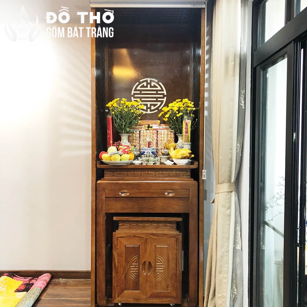 • Diện tích khiêm tốn: Phần lớn các căn hộ sử dụng ban thờ treo tường hoặc tủ thờ cỡ nhỏ với các kích thước phổ biến theo thước Lỗ Ban như 81cm, 89cm, 107cm. Điều này đòi hỏi bộ đồ thờ phải cực kỳ tinh gọn.