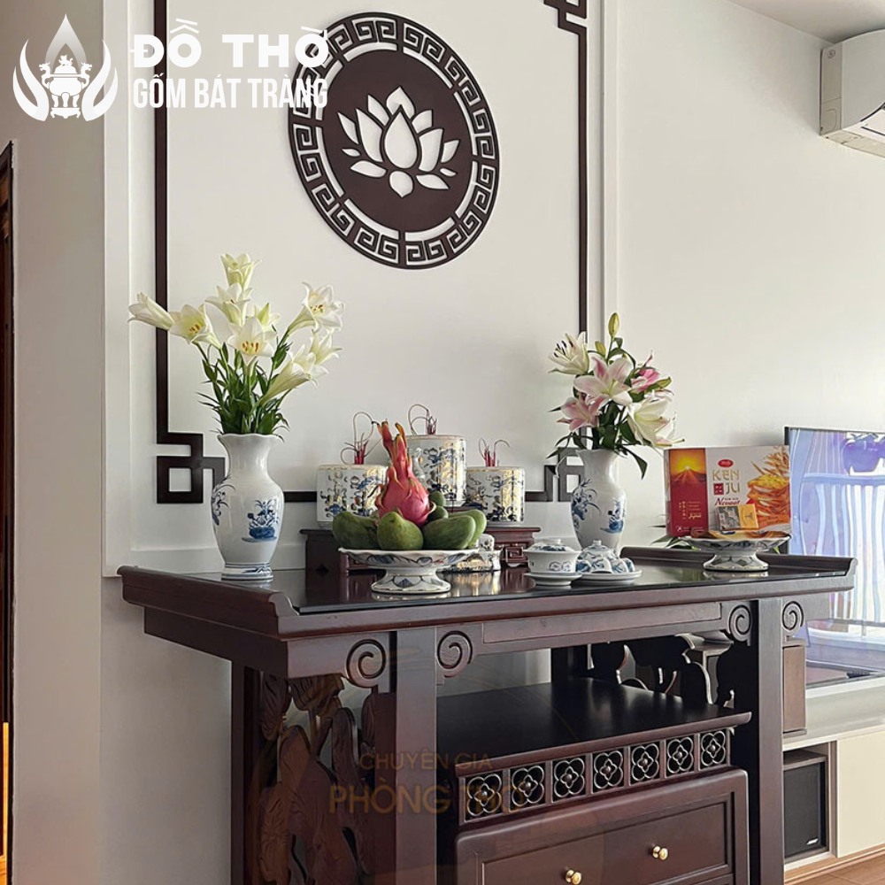 • Màu men và họa tiết nên chọn: Ưu tiên các dòng men trang nhã như men lam vẽ tay họa tiết hoa sen. Tông màu xanh-trắng dịu mắt không chỉ thanh lịch mà còn giúp không gian thờ tự trông sáng và rộng hơn, dễ dàng hài hòa với nội thất chung cư hiện đại.