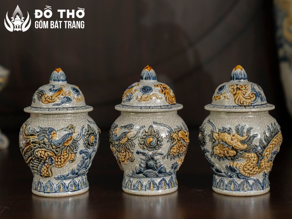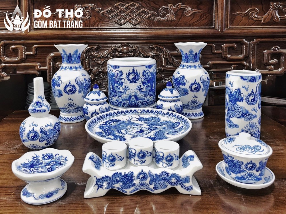 Họa tiết trên đồ thờ Bát Tràng có khả năng kích hoạt tài lộc, trấn trạch và mang lại bình an cho gia đạo. Trong không gian thờ tự chốn linh thiêng, mỗi nét vẽ mây nước, mỗi mảnh đắp nổi rồng phượng trên đồ thờ cúng đều mộ năng lượng riêng.